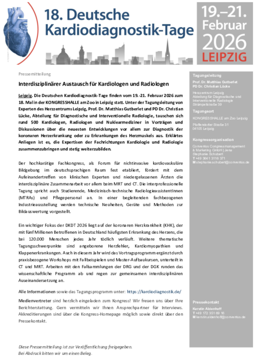 Die Deutschen Kardiodiagnostik-Tage finden vom 19.-21. Februar 2026 zum 18. Mal in der KONGRESSHALLE am Zoo in Leipzig statt. Unter der Tagungsleitung von Experten des Herzzentrums Leipzig, Prof. Dr. Matthias Gutberlet und PD Dr. Christian Lücke, Abteilung für Diagnostische und Interventionelle Radiologie tauschen sich rund 500 Kardiologen, Radiologen und Nuklearmediziner in Vorträgen und Diskussionen über die neuesten Entwicklungen vor allem zur Diagnostik der koronaren Herzerkrankung oder zu Erkrankungen des Herzmuskels aus.
